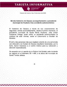 El Gobierno de Oaxaca a través de sus corporaciones de seguridad, brinda acompañamiento, desde el primer momento, al presidente municipal de Santa María Huatulco, Julio César Cárdenas Ortega; quien sufrió un accidente automovilístico la mañana de este viernes, sobre el Libramiento a Ocotlán de Morelos.