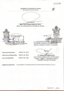 Documentos en poder de este medio y exhibidos por la universidad confirman que el reglamento institucional fue validado, autenticado y registrado ante la entonces Dirección de Programación y Evaluación y la Coordinación General de Educación Media y Superior, Ciencia y Tecnología (CGEMSySCyT).