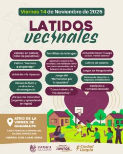 Oaxaca de Juárez, Oax. 13 de noviembre de 2025.- Del jueves 13 al sábado 15 de noviembre, el programa Latidos Vecinales se desplegará en tres puntos de la capital para acercar a niñas, niños y familias actividades educativas, recreativas y de participación comunitaria que fortalecen el tejido social y promueven espacios seguros.